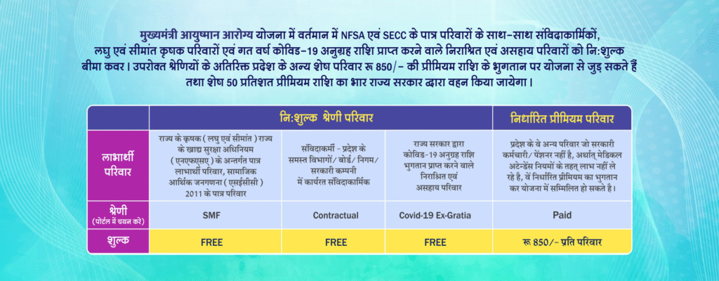 गरीबी रेखा से नीचे (बीपीएल), राष्ट्रीय खाद्य सुरक्षा अधिनियम (NFSA), सामाजिक-आर्थिक जाति जनगणना (SECC) 2011 के लाभार्थी, छोटे/सीमांत किसान, और संविदा कर्मचारी मुफ्त कवरेज के पात्र हैं।